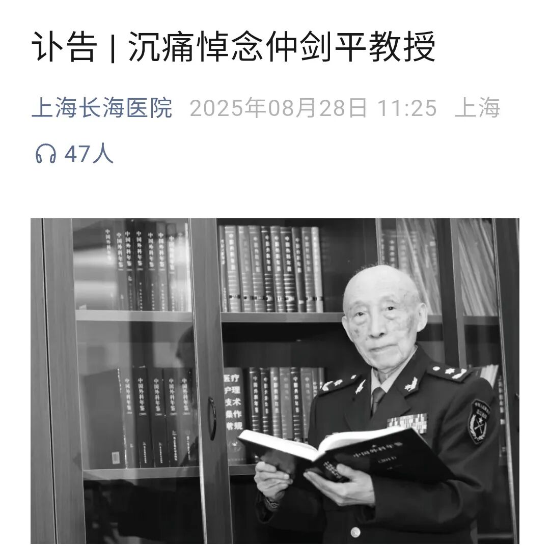 8月28日,记者从上海长海医院获悉,上海警备区杨浦第二退休干部休养所退休干部、原第二军医大学第一附属医院普外科教授(专业技术一级,文职特级)仲剑平同志,因病医治无效,于2025年8月26日13时35分在海军军医大学第一附属医院逝世,享年101岁。