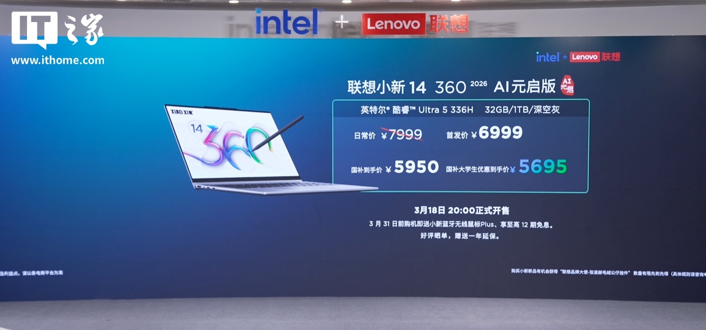IT之家 3 月 18 日消息最正规的配资公司,联想小新 14 360 2026 AI 元启版笔记本今日正式发布。该机搭载英特尔酷睿 Ultra 5 336H 处理器,辅以 32GB+1TB 规格,定价 7999 元、首发 6999 元(国补到手价 5950 元、国补大学生优惠价 5695 元)。