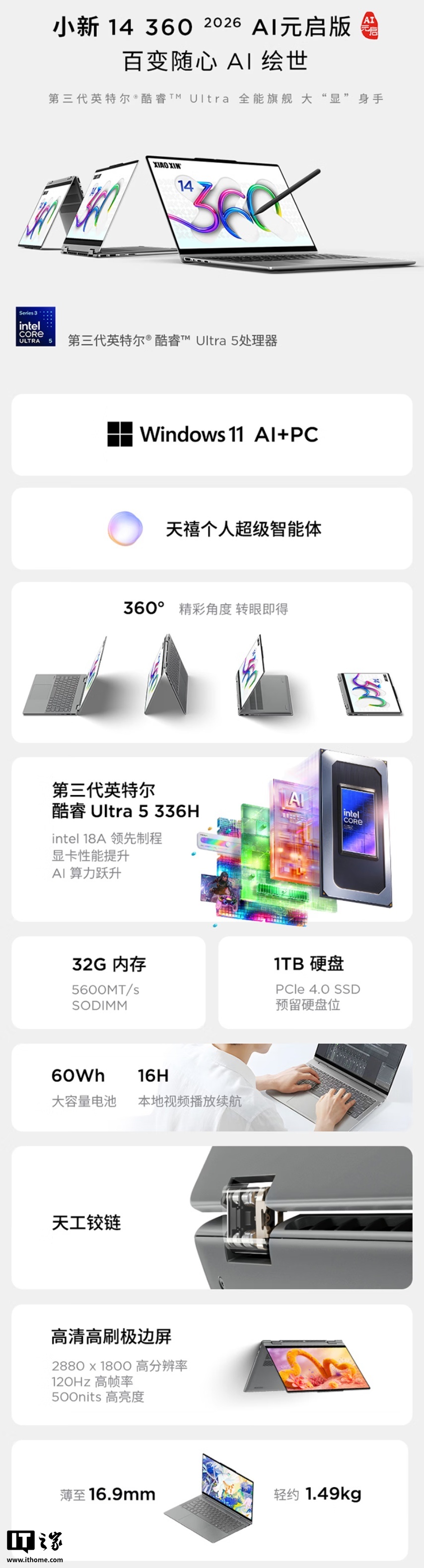 据介绍,联想小新 14 360 2026 AI 元启版预装 Windows 11 系统,内置天禧个人超级智能体;采用经典天工铰链设计,支持 360° 翻转,提供支架模式、PC 模式、平板模式和帐篷模式。