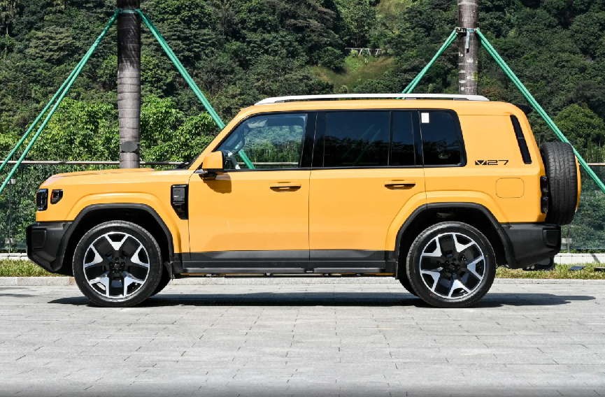 车身侧面的线条比较犀利,同时更容易凸显方盒子SUV的线条感。车门把手还是传统外露式的设计,搭配突出的轮拱,以及五辐轮圈、车顶行李架和车尾突出的全尺寸备胎,这些也都让iCAR V27的越野气息变得更加浓厚。另外在尺寸方面,iCAR V27的车长宽高分别是5055/1976/1894mm,同时还有2910mm的轴距。