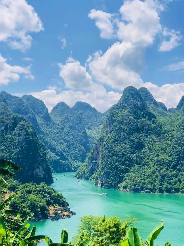 在喀斯特峰林的环抱中,万峰湖如同一颗碧蓝的宝石,镶嵌在这片广袤的大地上。它有着“高原千岛”的美誉,湖面开阔,岛屿星罗棋布。春季的湖水清澈见底,倒映着四周的青翠峰林,构成了一幅绝美的水墨丹青。
