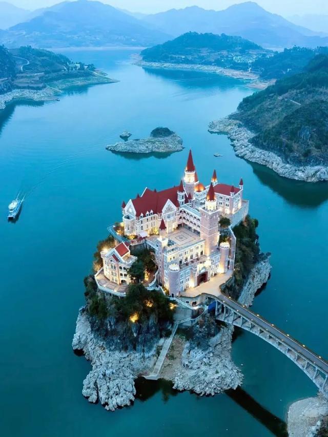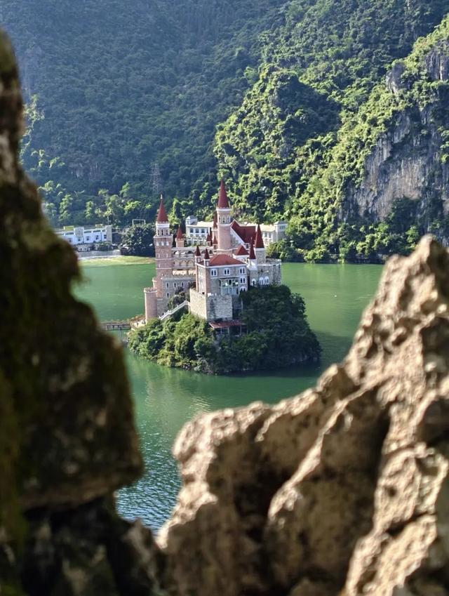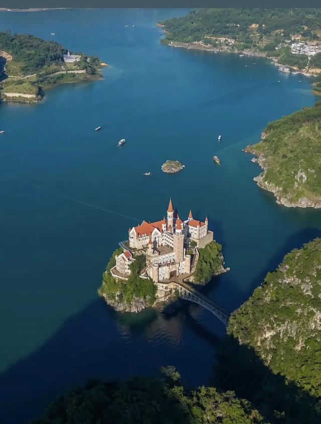 当你乘船泛舟湖上,远远望去,那座“中国天鹅堡”在碧波与青山的映衬下,宛如现实版的魔法世界,美得不似人间所有。尤其是在航拍镜头下,城堡、湖水、峰林交相辉映,构成了一幅梦幻般的画面,让人流连忘返。