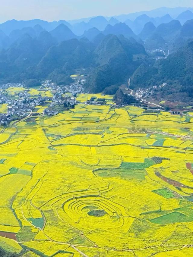 春天的兴义,是从万峰林的油菜花海中苏醒过来的。这里的春天,来得比别处更早,也更热烈。从一月到三月,金色的花海在喀斯特峰丛间肆意流淌,完美诠释了“花在峰中、峰在花中”的大自然立体感。从空中俯瞰,这片6000多亩的花海宛如一件不加修饰的大地艺术品,壮阔而震撼。