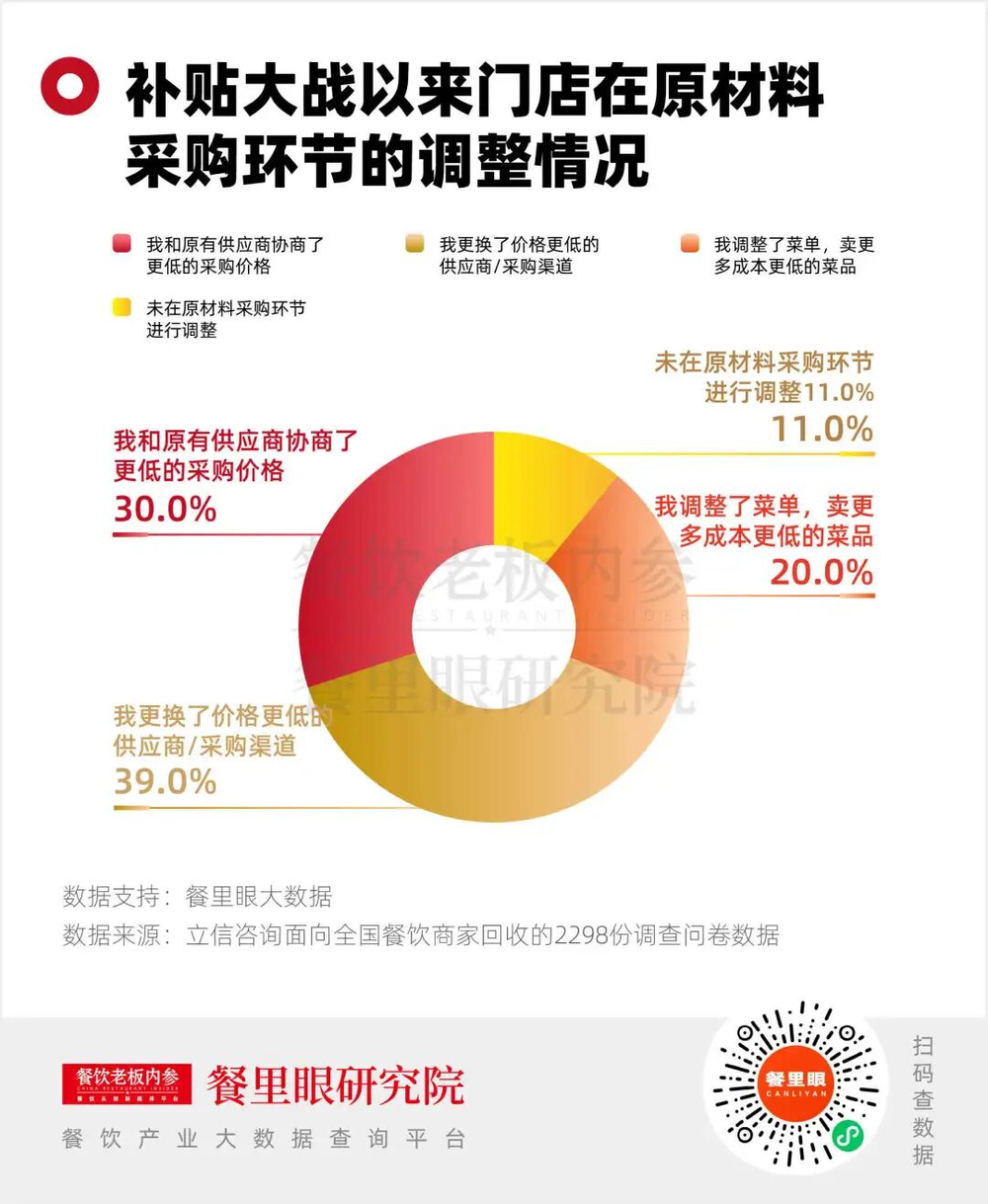 立信咨询数据显示,补贴大战以来,39%的商户开始更换原材料价格更低廉的供应商,30%强化与供应商的议价博弈,20%选择增加低成本菜品占比。
