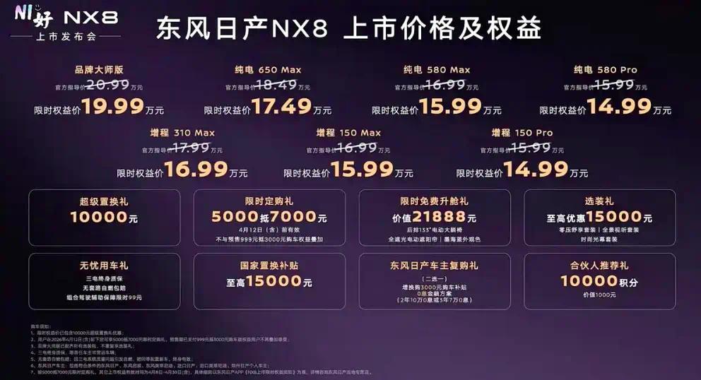 作为东风日产N序列的第三款产品,东风日产NX8现已正式上市,共推出7款车型,官方指导价15.99万-20.99万元,限时权益价14.99万-19.99万元。东风日产NX8基于天演架构打造,提供增程与纯电的动力选项,CLTC工况纯电续航里程至高650公里。另外据了解,东风日产NX8纯电版上市即开启交付,增程版计划于5月中下旬陆续交付。